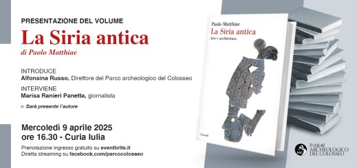 Mercoledì 9 Aprile 2025, in Curia Iulia, per iniziativa del parco archeologico del Colosseo, presentazione del libro “La Siria antica. Arte e architettura”, di Paolo Matthiae, edito da Einaudi. Introduce Alfonsina Russo, direttore del parco archeologico del Colosseo. Interviene Marisa Ranieri Panetta, archeologa e scrittrice. Letture a cura di Sandra Toffolatti. Sarà presente l’Autore. ingresso da largo della Salara Vecchia. Ingresso libero fino ad esaurimento posti con prenotazione obbligatoria su https://matthiae_curia.eventbrite.it. Diretta streaming su facebook.com/parcocolosseo.