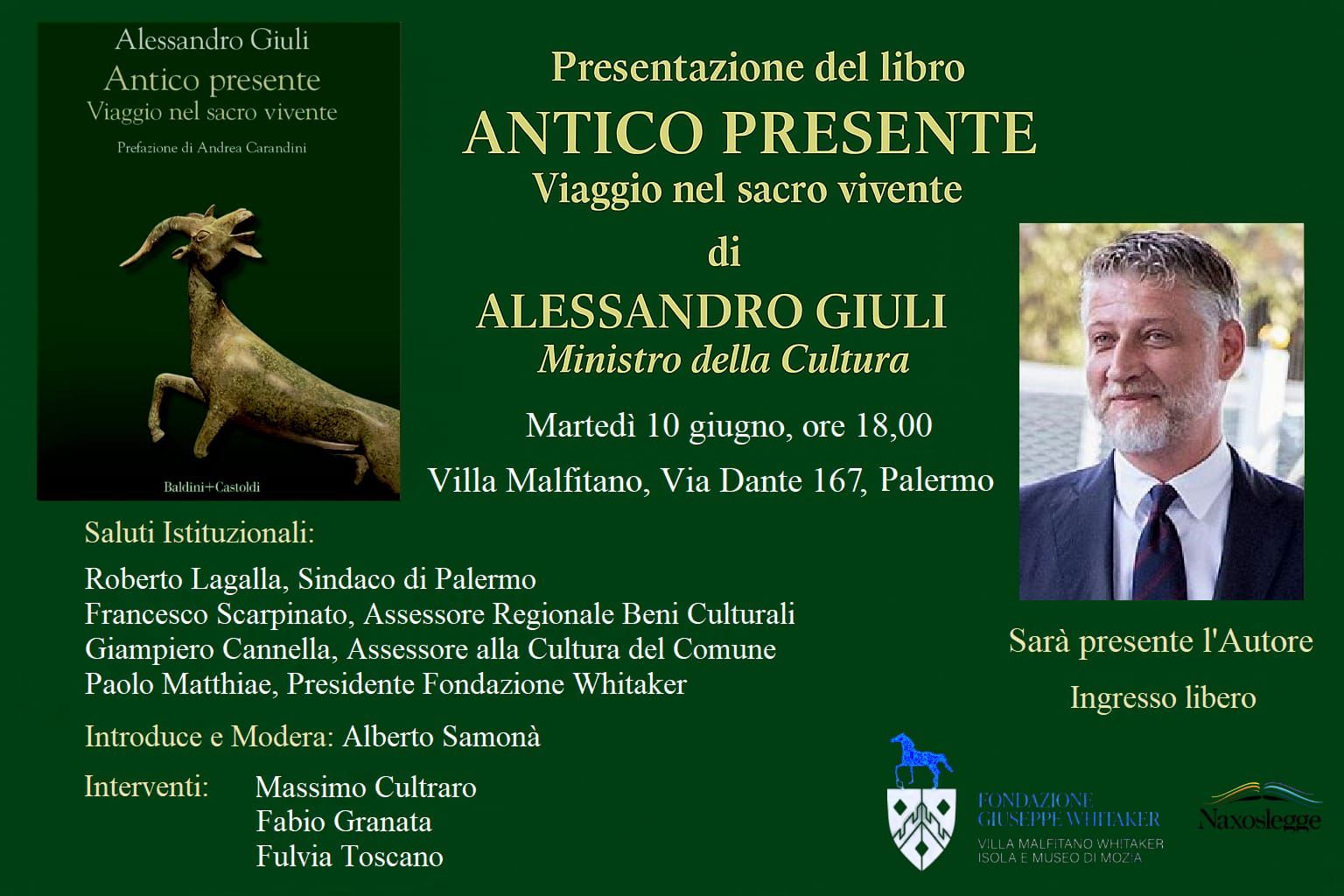Martedì 10 giugno 2025, alle 18, a Villa Malfitano in via Dante a Palermo, presentazione del libro “Antico Presente. Viaggio nel sacro vivente” di Alessandro Giuli, giornalista, saggista, ministro della Cultura. Dopo i saluti istituzionali di Roberto Lagalla, sindaco di Palermo; Francesco Scarpinato, assessore regionale dei Beni culturali e dell’Identità siciliana; Giampiero Cannella, assessore alla Cultura del Comune di Palermo; e Paolo Matthiae, presidente della Fondazione Whitaker, alla presenza dell’autore, il ministro Giuli, intervengono Massimo Cultraro, archeologo e docente universitario; Fabio Granata, presidente dell’associazione “Articolo 9”, e Fulvia Toscano, direttrice artistica di NaxosLegge – Festival delle narrazioni, della lettura e del libro. Modera il giornalista e scrittore Alberto Samonà. La presentazione è organizzata grazie alla collaborazione della Fondazione Whitaker, insieme a NaxosLegge. L’ingresso è libero fino a esaurimento posti.