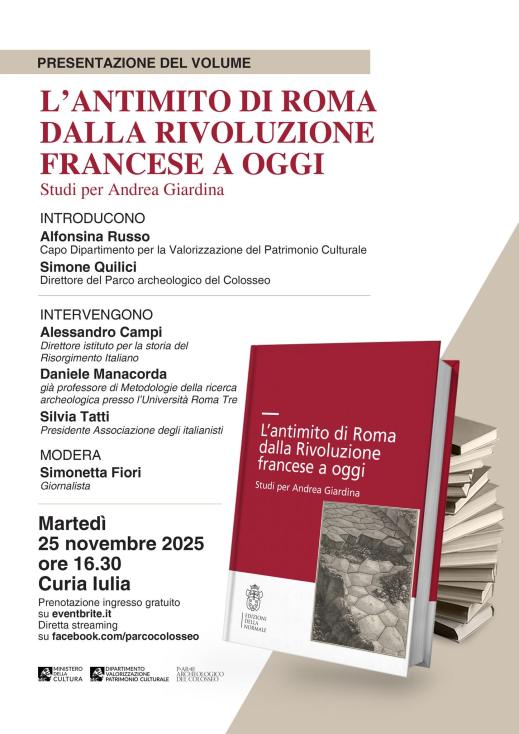 Martedì 25 novembre 2025, alle 16.30, in Curia Iulia, per iniziativa del parco archeologico del Colosseo presentazione del libro “L’antimito di Roma dalla Rivoluzione francese a oggi. Studi per Andrea Giardina” a cura di Paola S. Salvatori (edizioni Scuola Normale Superiore). Introducono Alfonsina Russo, capo dipartimento per la Valorizzazione del Patrimonio culturale; Simone Quilici, direttore del parco archeologico del Colosseo. Intervengono Alessandro Campi, direttore Istituto per la Storia del Risorgimento italiano; Daniele Manacorda, già professore di Metodologia della ricerca archeologica all’università Roma Tre; Silvia Tatti, presidente Associazione degli Italianisti. Modera Simonetta Fiori, giornalista. ingresso libero da largo della Salara Vecchia con prenotazione obbligatoria fino ad esaurimento posti al link https://giardina25novembre.eventbrite.it. Diretta streaming sulla pagina Facebook del parco archeologico del Colosseo.