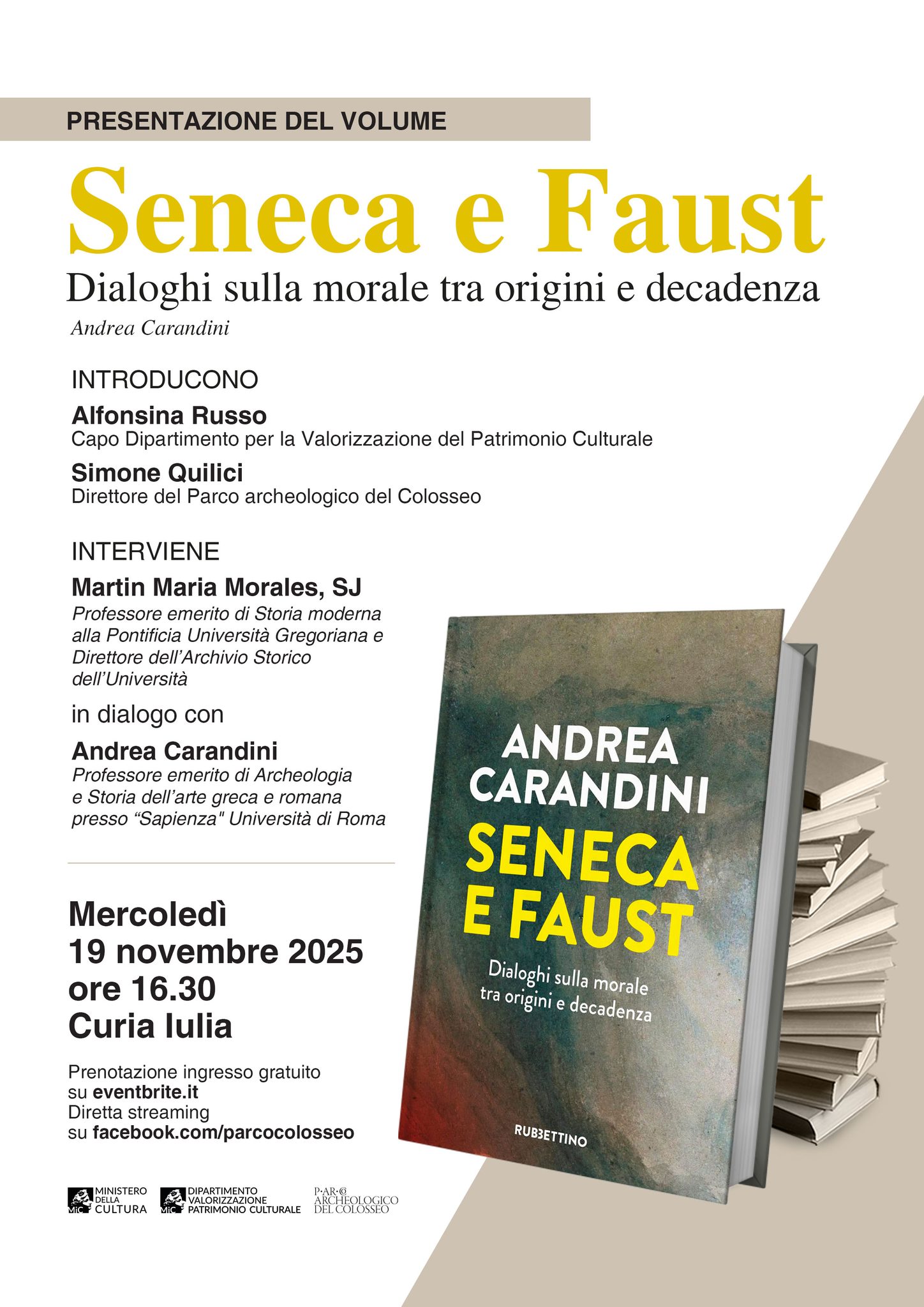 Mercoledì 19 novembre 2025, in Curia Iulia, alle 16.30, il parco archeologico del Colosseo presenta il libro di Andrea Carandini “Seneca e Faust. Dialoghi sulla morale tra origini e decadenza” (Rubettino Editore). Introducono Alfonsina Russo, capo dipartimento per la Valorizzazione del Patrimonio culturale; Simone Quilici, direttore del parco archeologico del Colosseo. Interviene Martin Maria Morales, SJ, professore emerito di Storia moderna alla Pontificia università Gregoriana e direttore dell’archivio storico dell’università, in dialogo con Andrea Carandini, professore emerito di Archeologia e Storia dell’Arte greca e romana alla Sapienza Università di Roma. Diretta streaming sulla pagina Facebook del parco archeologico del Colosseo. Ingresso da largo della Salara Vecchia, libero con prenotazione obbligatoria fino ad esaurimento posti al link https://carandini19novembre.eventbrite.it.