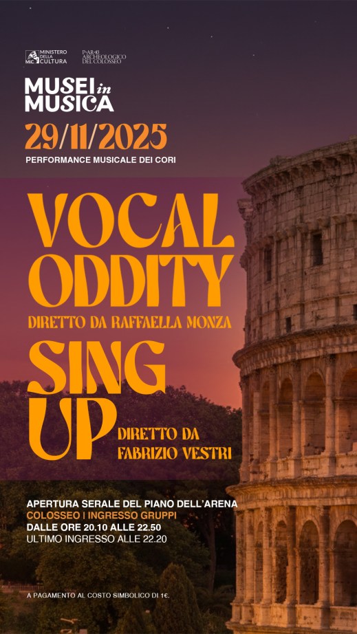 Sabato 29 novembre 2025 torna l’appuntamento in notturna con “Musei in Musica”, la manifestazione promossa da Roma Capitale, sovrintendenza Capitolina ai Beni culturali, organizzata da Zètema Progetto Cultura. Il parco archeologico del Colosseo aderisce con un’apertura serale straordinaria del Colosseo che sarà animata dalle performance dei cori Vocal Oddity (diretto da Raffaella Monza) e Sing Up (diretto da Fabrizio Vestri). L’ingresso avverrà da piazza del Colosseo a partire dalle 20.10 con ultimo accesso alle 22.20.