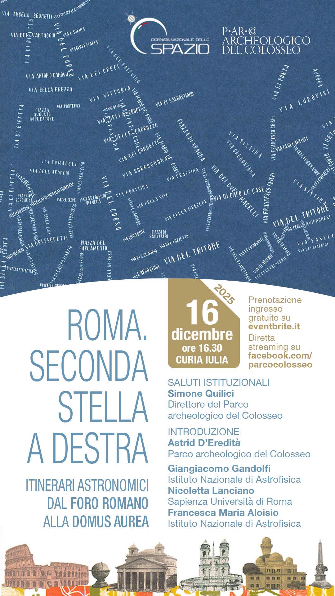 Di astri, pensieri antichi sulle stelle e 6 itinerari tra scienza, astronomia e arte per un viaggio che porterà i lettori a riscoprire quartieri del centro di Roma e monumenti celebri, ma anche luoghi un po’ segreti. Se ne parla martedì 16 dicembre 2025, in Curia Iulia, alle 16.30, in occasione della Giornata Nazionale dello Spazio, con la presentazione del libro “Roma. Seconda Stella a destra”, la collana di guide astronomiche “Seconda stella a destra” curata dall’INAF – Istituto italiano di Astrofisica che accompagna a scoprire i luoghi “celesti” custoditi nelle città italiane, lungo itinerari tra arte, turismo e scienza, disponibile al momento per le città di Roma, Padova, Firenze, Palermo. In Curia Iulia dunque, un focus speciale dedicato alla guida astronomica di Roma, a cura di Giangiacomo Gandolfi, Nicoletta Lanciano, Francesca M. Aloisio, Maria Teresa Menna, Valeria Cappelli, con illustrazioni di Andrea Meneghetti. ingresso libero da largo della Salara Vecchia con prenotazione obbligatoria fino ad esaurimento posti al link https://secondastellacuria.eventbrite.it. Dopo i saluti istituzionali di Simone Quilici, direttore del parco archeologico del Colosseo, e l’introduzione di Astrid D’Eredità, parco archeologico del Colosseo, Intervengono gli autori: Giangiacomo Gandolfi, astrofisico, Responsabile Museo, Biblioteca e Archivio Storico INAF Osservatorio Astronomico di Roma; Nicoletta Lanciano, docente di Didattica delle scienze e Didattica della geometria e dello spazio, Sapienza Università di Roma; Francesca M. Aloisio, primo tecnologo e responsabile valorizzazione INAF. Sei itinerari tra scienza, astronomia e arte per un viaggio che vi porterà a riscoprire quartieri del centro e monumenti celebri ma anche luoghi un po’ segreti. Dalle simmetrie del Pantheon all’astrologia dipinta a Villa Medici, dalla meridiana che taglia il pavimento di Santa Maria degli Angeli al Colosseo e alla Domus Aurea, orientate con ’il cielo’. Ma anche i luoghi di Galileo Galilei, che a Roma ‘svelò’ il telescopio e subì il famoso processo nella chiesa di S. Maria Sopra Minerva, gli strumenti astronomici della Biblioteca Casanatense e la scienza nascosta a Villa Borghese.