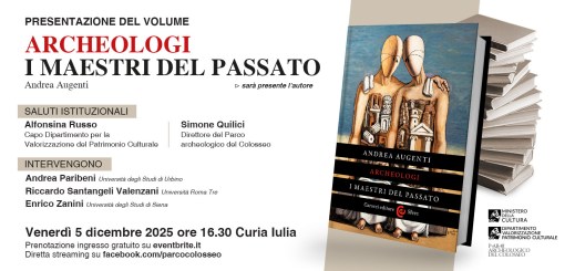 Venerdì 5 dicembre 2025, in Curia Iulia, per iniziativa del parco archeologico del Colosseo, alle 16.30, presentazione del libro “Archeologi. I maestri del passato” di Andrea Augenti (Carocci editore). Dopo i saluti istituzionali di Alfonsina Russo, capo dipartimento per la Valorizzazione del Patrimonio culturale, e Simone Quilici, direttore del parco archeologico del Colosseo, intervengono, alla presenza dell’autore, Andrea Paribeni, università di Urbino; Riccardo Santangeli Valenzani, università Roma Tre; Enrico Zanini, università di Siena. ingresso libero da largo della Salara Vecchia con prenotazione obbligatoria fino ad esaurimento posti al link https://augenti5dicembre.eventbrite.it. Diretta streaming sulla pagina Facebook del parco archeologico del Colosseo.