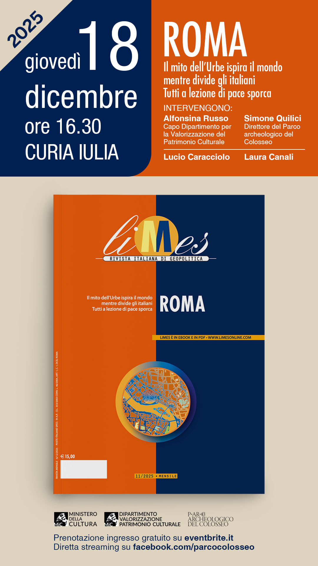 Giovedì 18 dicembre 2025, in Curia Iulia, alle 16.30, per iniziativa del parco archeologico del Colosseo, presentazione di “Roma”, numero 11/25 della rivista italiana di geopolitica Limes, che si interroga sul mito e le prospettive della Città eterna. Nella rivoluzione geopolitica in corso, l’Urbe si presenta infatti come modello d’impero e res publica capace di generare ordine e legame sociale. Esattamente ciò che manca nel contesto attuale. Dopo i saluti istituzionali di Alfonsina Russo, capo dipartimento per la Valorizzazione del Patrimonio culturale, e Simone Quilici, direttore del parco archeologico del Colosseo, intervengono Lucio Caracciolo, direttore e fondatore di Limes e Scuola di Limes, e Laura Canali, esperta in cartografia geopolitica, responsabile delle copertine e della cartografia di Limes. ingresso libero da largo della Salara Vecchia con prenotazione obbligatoria fino ad esaurimento al link https://limes11.eventbrite.it. Diretta streaming sulla pagina Facebook del parco archeologico del Colosseo.