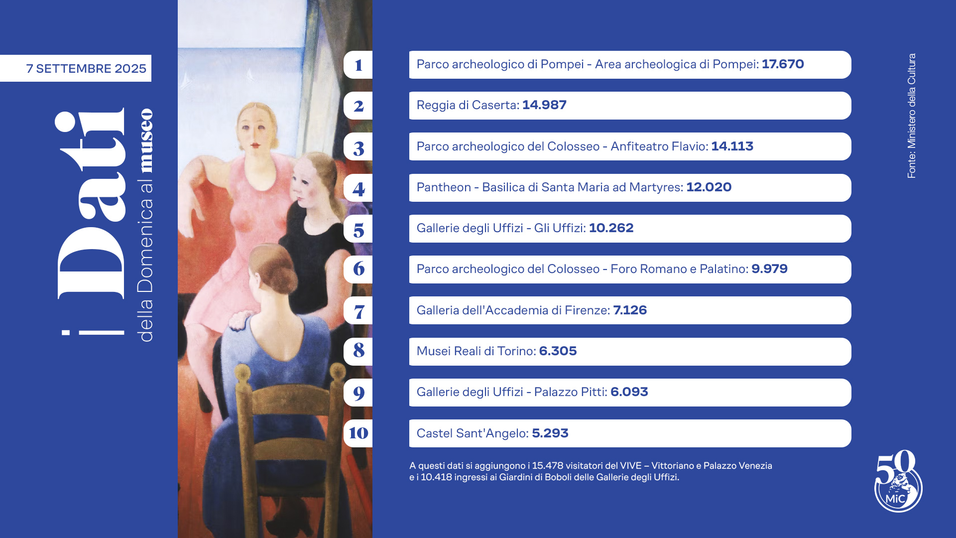 #domenicalmuseo. Nella prima domenica di settembre Pompei con 17.670 ingressi torna al primo posto della classifica assoluta, seguito dalla Reggia di Caserta (14.987 ingressi) e dal Colosseo (14.113 ingressi)
