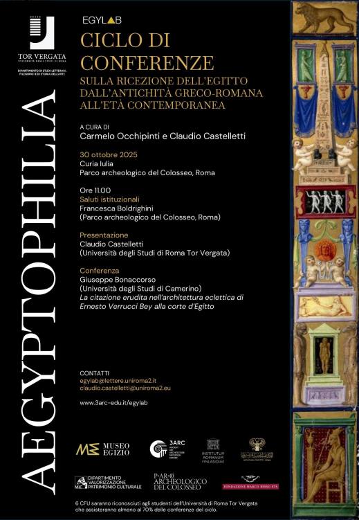 Giovedì 30 Ottobre 2025 in Curia Iulia, alle 11, la conferenza “La citazione erudita nell’architettura eclettica di Ernesto Verrucci Bey alla corte d’Egitto”, a cura di Giuseppe Bonaccorso (università di Camerino). Accesso da largo della Salara Vecchia. Ingresso libero con prenotazione obbligatoria fino ad esaurimento posti su https://egitto30ottobre.eventbrite.it. Dopo i saluti istituzionali di Francesca Boldrighini (parco archeologico del Colosseo), introduce Claudio Castelletti (università di Roma Tor Vergata). Nel 2024, per iniziativa del Corso di studi magistrali in Storia dell’Arte dell’università di Roma Tor Vergata, il dipartimento di Studi letterari, filosofici e di Storia dell’Arte dello stesso Ateneo ha istituito in convenzione col museo Egizio di Torino il laboratorio di ricerca EgyLab, dedicato alla ricezione dell’Egitto dall’Antichità greco-romana all’età contemporanea, diventato laboratorio didattico a partire dall’anno accademico 2025-2026. Nel quadro delle attività di EgyLab, il Dipartimento ha promosso nel 2025 in convenzione col parco archeologico del Colosseo un ciclo di conferenze intitolato Aegyptophilia, a cura di Carmelo Occhipinti e Claudio Castelletti, patrocinato dal DiVA – dipartimento di Valorizzazione del Patrimonio culturale, dal museo Egizio di Torino, dall’Accademia d’Egitto, dall’Institutum Romanum Finlandiae – Villa Lante al Gianicolo, dalla Fondazione Marco Besso e dal 3ARC – Ancient Art Architecture Reception Center. Il ciclo è stato ideato non solo come un’occasione di confronto interdisciplinare tra studiosi e studiose di diversa formazione scientifica e metodologica (archeologi, egittologi, storici, storici dell’arte, storici dell’architettura, ecc.), ma anche come uno “spazio” di condivisione e accessibilità del sapere, per promuovere e valorizzare il dialogo tra cultura egiziana e cultura europea, in particolare italiana.