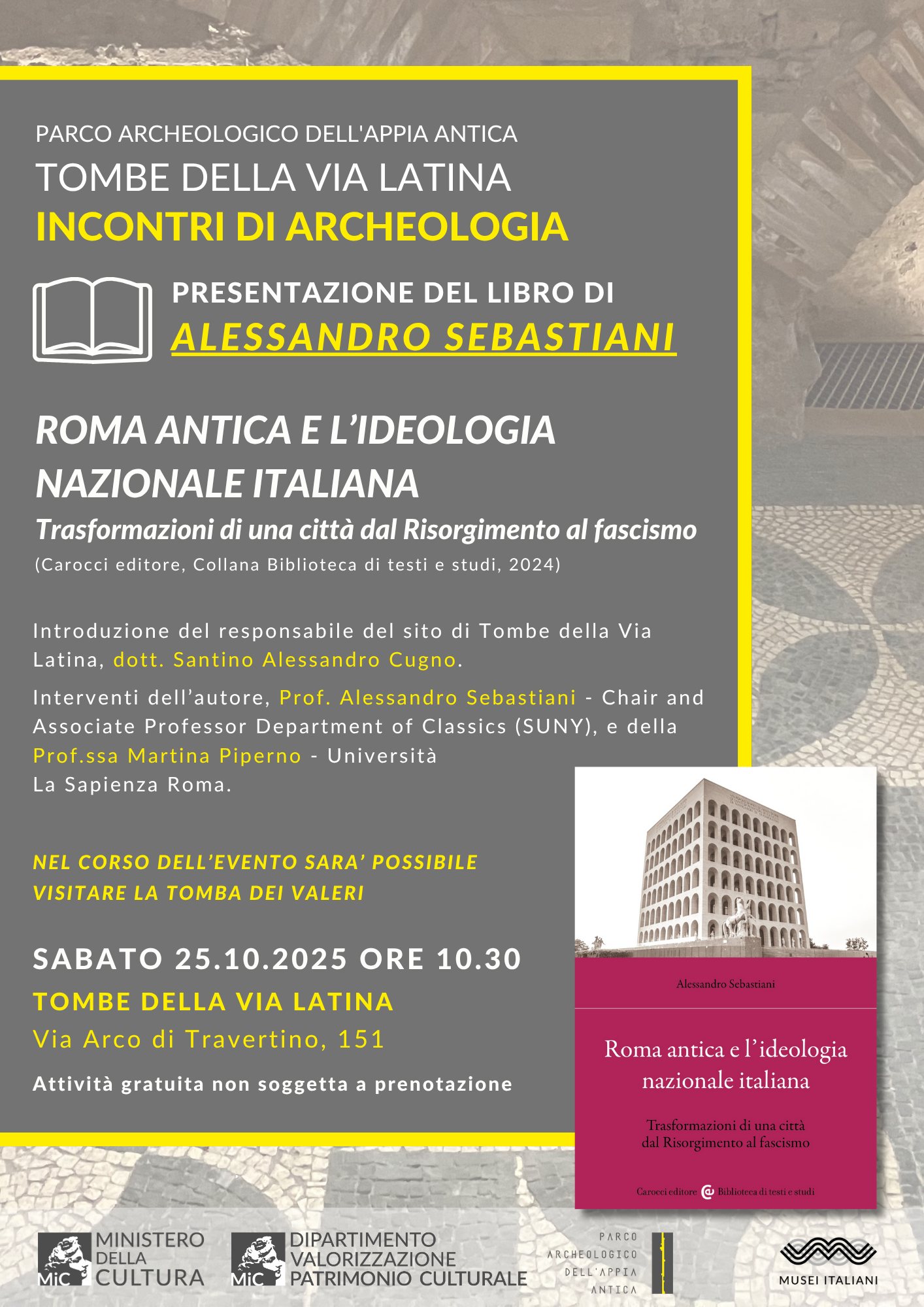 Parco archeologico dell’Appia Antica. Per gli “Incontri di archeologia alle Tombe della via Latina” presentazione del libro “Roma antica e l’ideologia nazionale italiana. Trasformazioni di una città dal Risorgimento al fascismo” di Alessandro Sebastiani (Carocci editore) e visita guidata speciale alla Tomba dei Valeri