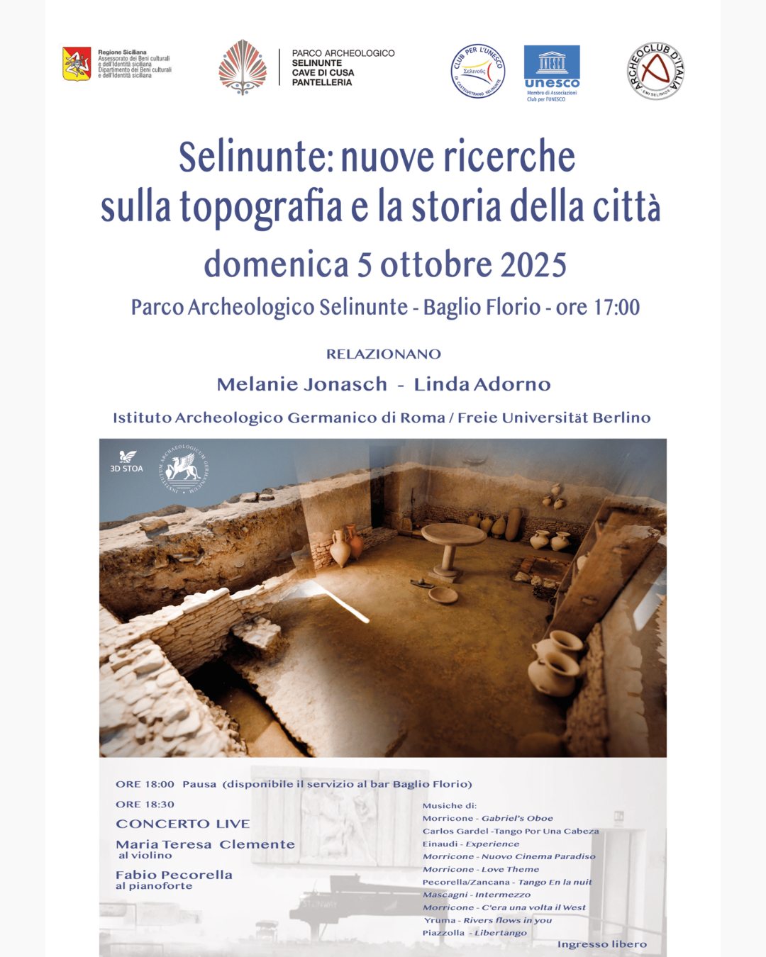 Domenica 5 ottobre 2025, alle 17, al Baglio Florio del parco archeologico di Selinunte, Cave di Cusa e Pantelleria, l’incontro “Selinunte: nuove ricerche sulla topografia e la storia della città”, appuntamento pubblico promosso dal parco archeologico di Selinunte con il Club per l’Unesco di Castelvetrano Selinunte e l’Archeoclub d’Italia di Castelvetrano, dedicato agli ultimi studi su mappa urbana, vie d’acqua e assetti insediativi dell’antica Selinunte. Intervengono Melanie Jonasch e Linda Adorno (Istituto Archeologico Germanico di Roma / Freie Universität Berlin), portando al Parco i risultati di ricerche e cantieri scientifici internazionali. Ingresso libero fino a esaurimento posti. Alle 18, pausa con servizio bar attivo al Baglio Florio; e alle 18.30, concerto live con Maria Teresa Clemente (violino) e Fabio Pecorella (pianoforte). In programma pagine di Morricone, Gardel, Einaudi, Mascagni, Yiruma, Piazzolla.