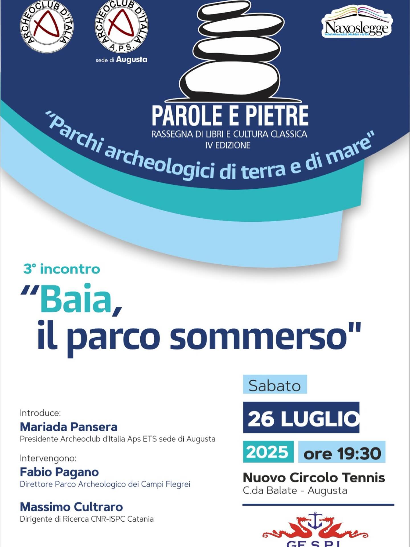 Sabato 26 luglio 2025, alle 19.30, al Nuovo circolo Tennis di Augusta (Sr), in contrada Balate, “Baia. Il parco sommerso”, terzo e ultimo incontro del ciclo “Parole e pietre. Rassegna di libri e cultura classica”, giunta alla IV edizione, quest’anno dedicato a “Parchi archeologici di terra e di mare poco conosciuti o poco raccontati”, promosso dall’Archeoclub d’Italia sede di Augusta. Questa volta riflettori puntati su una delle cinque meraviglie sommerse in Italia, il Parco sommerso di Baia, Campi Flegrei, Napoli. Antiche rovine sommerse; “immergersi” e visitare un museo straordinario dove la vita marina e i resti storici si fondono in un’esperienza totalmente differente da uno spazio espositivo a terra. Introduce Mariada Pansera, presidente dell’Archeoclub d’Italia sede di Augusta. Intervengono Fabio Pagano, direttore del parco archeologico dei Campi Flegrei, e Massimo Cultraro, archeologo del Cnr-Ispc di Catania.