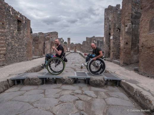 Pompei per tutti: Danilo Ragona e Luca Paiardi sulla loro carrozzina attraversano una strada di Pompei sui passaggi pedonali sopraelevati (foto parco archeologico di Pompei)
