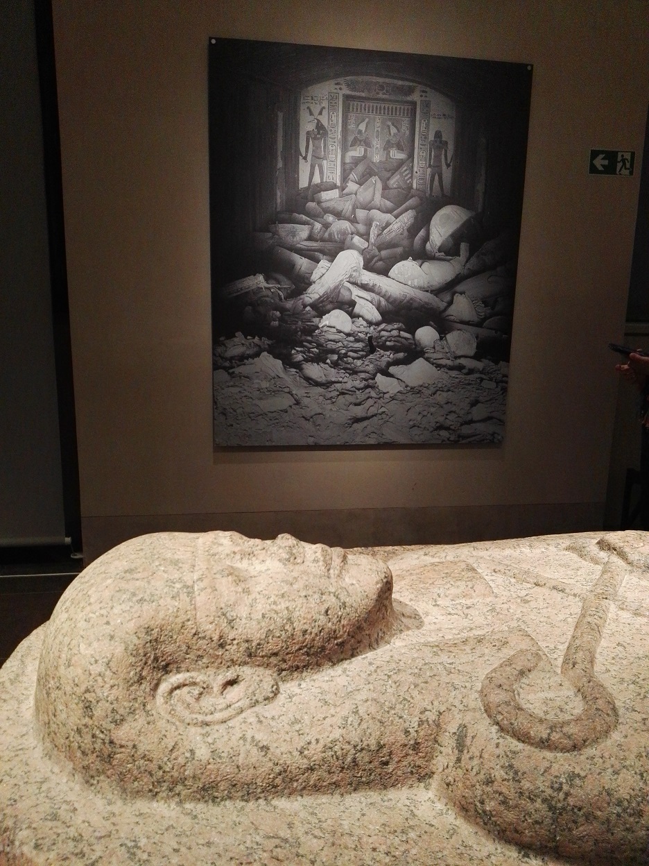 I segreti della tomba di Khaemwaset, figlio di Ramses III. Al centro della sala dedicata al Terzo Periodo Intermedio c’è un sarcofago in pietra in granito rosa che però appartiene al Nuovo Regno. È infatti il coperchio di un sarcofago del principe ramesside Khaemwaset, figlio di Ramses III. Perché è qui? “Per capirlo – interviene Greco – dobbiamo osservare bene due foto esposte ai lati della galleria. Nella prima si vede la situazione che Schiaparelli e la sua squadra trovarono all’interno della tomba di Khaemwaset. Le pareti hanno decorazioni tipiche dell’età ramesside. E c’è un gran disordine all’interno della sala: serie di sarcofagi e ushabti affastellati l’uno sull’altro. Ci rendiamo immediatamente conto che questa tomba è stata riutilizzata più volte. Dopo Khaemwaset, la tomba è diventata una sepoltura di famiglia. Quindi la tomba è stata violata: vediamo pezzi di mummia, sarcofagi aperti. Probabilmente una penetrazione avvenuta in antico in cui coloro che sono entrati all’interno della tomba hanno tirato fuori le mummie in cerca di materiali preziosi. E finalmente all’inizio del Novecento arriva la Missione Archeologica Italiana in Egitto che trova all’interno della tomba di Khaemwaset delle sepolture di gruppo che appartenevano a due famiglie di coltivatori di loto”. Nella seconda foto si vede la situazione dopo una prima ricognizione e la pulitura della sala. “Le modalità di pulizia si sono concluse e si vede che il sarcofago – continua Greco -, il coperchio del sarcofago di Khaemwaset, è posizionato da solo. Quindi quella la situazione nell’età ramesside, mentre le sepolture della XXV dinastia costituivano una seconda fase, poi vi era stata la violazione della tomba, e infine era arrivata la Missione Archeologica Italiana in Egitto. Ed ecco quindi questo sarcofago al centro della sala ci vuole ridare la contestualizzazione archeologica, ci vuole fare capire come sia avvenuto lo scavo, come fosse la situazione all’interno della tomba di Khaemwaset, e come i sarcofagi della XXV dinastia che erano all’interno siano adesso disposti in queste sale”.