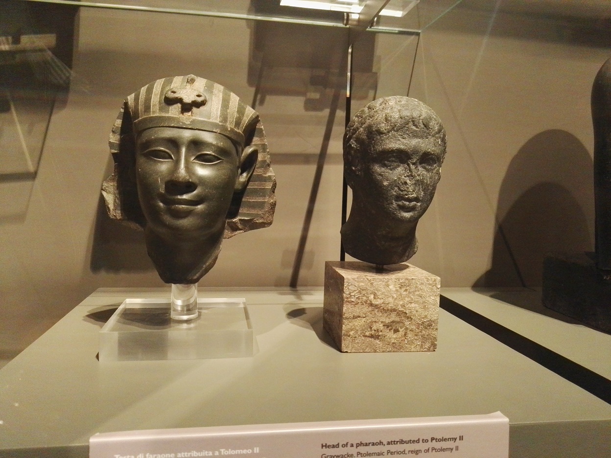 Tolomeo II Filadelfo nelle fattezze di faraone e in quelle ellenistiche: teste conservate al museo Egizio di Torino (foto Graziano Tavan)