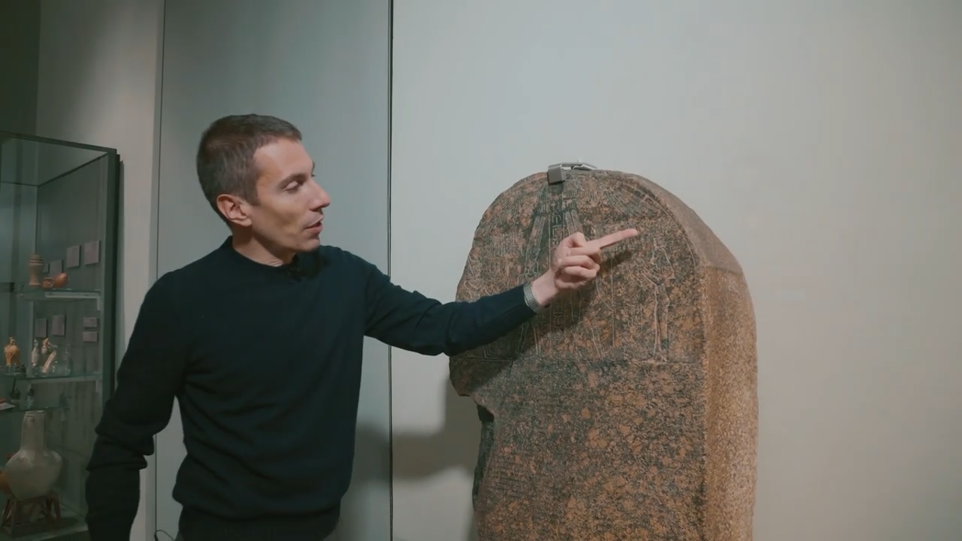 Il direttore Christian Greco indica la figura di Cleopatra sulla stele cosiddetta di Callimaco (foto museo Egizio)