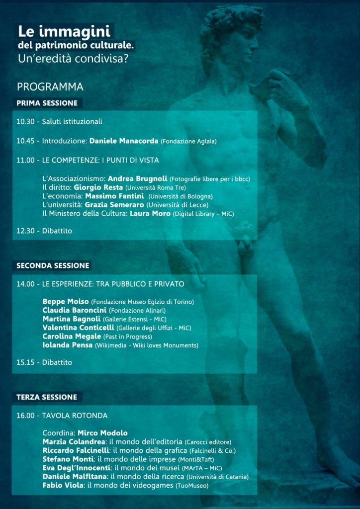 Il tema, ricco di sfaccettature, sarà affrontato dal punto di vista della ricerca, dell’economia, del diritto e dell’associazionismo e sarà arricchito dall’illustrazione di alcune esperienze in atto facendo riferimento in modo particolare – ma non esclusivo – al territorio della Toscana. Nell’ambito del convegno si confrontano dunque diverse competenze, e in particolare è lasciato ampio spazio al mondo degli esperti di patrimonio culturale, diritto, economia e pubblica amministrazione, senza trascurare i punti di vista dell’associazionismo culturale. Conclude l’incontro una tavola rotonda che darà voce ai potenziali utilizzatori delle immagini, e quindi alle diverse professioni legate al patrimonio culturale, all’editoria e all’industria creativa.