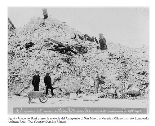 “La grande passione per l’antico”, anticipa Vio, “spinse Giacomo Boni veneziano, già avviato ad una strepitosa carriera di archeologo di valore internazionale, nel 1903, a studiare i resti della fondazione dell’antica torre della sua città. Le cronache tramandano che alla morte del doge Pietro Tribuno nel 912 d.C., le fondazione del futuro campanile di san Marco erano ultimate. La prima chiesa di san Marco voluta dal doge Giustiniano Particiaco che fece utilizzare per la sua erezione le pietre non usate per sant’Ilario, aveva poco più di ottant’anni. Per tutte le opere edili importanti si recuperavano i resti di Altino distrutta e le spolia di edifici tardo antichi, crollati nel susseguirsi delle invasioni barbariche che sconvolsero il nord est nei secoli dal V al VII. Boni, sicuro della eredità romana dell’area lagunare, ricerca nelle fondazioni del campanile testimonianze che ne attestino la presenza. Oggi nel lapidario della basilica di san Marco esistono pochi significativi documenti lapidei e laterizi di allora. Nel riordino della loggetta del Sansovino è augurabile che si possano esporre Questi reperti assieme ad altri documenti, come modelli della ricostruzione del Campanile e copie (del 1903) delle statue del Sansovino che ornano la Loggetta. Un coinvolgente apparato fotografico del crollo della torre meglio illustrerà le vicende di quell’evento”.