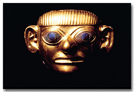 Il nostro speciale viaggio si chiude in Perù con la straordinaria maschera funebre in rame ricoperto da lamina d’oro della cultura chimú-lambayeque (1300 d.C.). Nel Cinquecento, il cronista spagnolo Miguel Cabello de Valboa raccolse il mito che narrava l’arrivo dal mare dell’eroe fondatore Ñaymlap e del suo seguito regale. Approdato in quel tratto della costa pacifica che da lui avrebbe preso il nome, Ñaymlap era preceduto da un suonatore di buccina marina e da un servitore che precedeva i suoi passi spargendo polvere di conchiglie. Il capostipite delle genti di Lambayeque deriva il nome da un uccello acquatico (namla). Tra gli attributi, le ali e gli “occhi alati”, riproducenti le macchie oculari di alcuni uccelli o combinazione dell’occhio umano con ali. Il mito narra che in punto di morte sul dorso del sovrano crebbero ali ed egli volò al cielo lasciando la sua immagine intagliata nello smeraldo: l’idolo Yampallec, “icona di Ñaymlap”, che avrebbe assicurato al suo popolo prosperità e potere. Sedotto da un dèmone-femmina, l’ultimo sovrano, Fempellec, volle trasferire altrove la sacra immagine. Trenta giorni di piogge e un anno di siccità mutarono la fertile valle in terra desolata. Le maschere funerarie in oro, o rame dorato come questo esemplare, riproducono fattezze e attributi dell’antenato mitico: gli “occhi alati” e i dischi auricolari (orejeras) – gli stessi dei sovrani dei moche – contornati da una serie di globuli sbalzati, probabile simbolo della Luna, madre dell’umidità notturna, o del Sole padre della luce e della pioggia. Applicata al fardo funerario – l’involto di tessuti che copriva il corpo in posizione fetale – la maschera manifestava la partecipazione del defunto alla regalità divina dell’Antenato-Uccello. Dagli occhi cadono lacrime raffigurate da globuli di quarzo (in altri esemplari di resina di algarrobo).