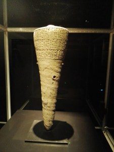 Il cono della collezione Sinopoli Prima di lasciare il Mediterraneo (sala I) e raggiungere finalmente il Nilo, vale la pena soffermarsi su un pezzo eccezionale della collezione privata della famiglia Sinopoli. Si tratta di un chiodo di fondazione, perfettamente conservato, databile all’epoca accadica (2350 -2200 ca a.C.), che proviene dalla città di Adab, nel sud dell’Iraq, centro molto importante – come ricordano gli archivi di Ebla – già in età presargonica, e poi, sotto l’impero di Accad, la città più importante dopo Kis e Accad. Il chiodo di fondazione, con il nome del sovrano e del dio, erano posti nelle fondazioni dei templi costruiti o restaurati. “Il chiodo di fondazione della collezione vicino-orientale della famiglia Sinopoli”, sottolineano gli assiriologi, “è un pezzo di eccezionale valore storico perché cita il nome di un sovrano di Adab che finora ci era sconosciuto”.