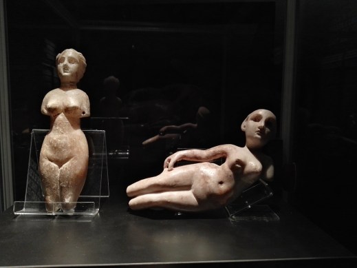 Figurine femminili in alabastro (una in piedi e l’altra distesa) provenienti dall’area mesopotamica (foto Graziano Tavan)