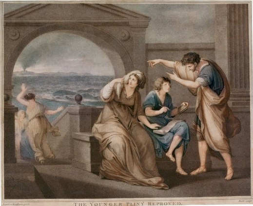 Nell’incisione di Thomas Burke ispirata a un dipinto di Angelika Kauffmann rappresenta Plinio il Giovane rimproverato mentre era in atto l’eruzione del Vesuvio