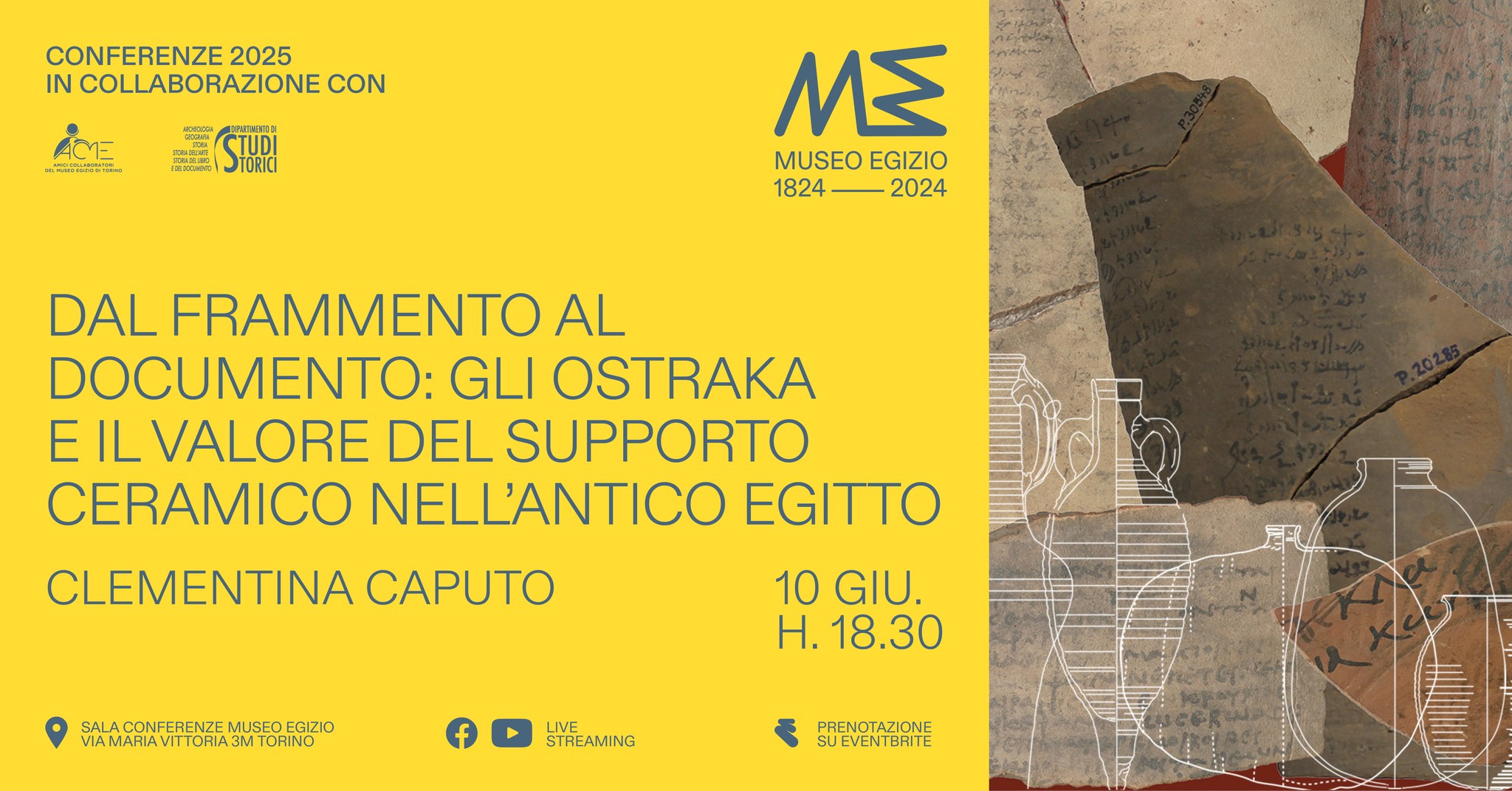 Nel momento in cui un testo viene apposto su un frammento ceramico, tale coccio diventa un documento, o meglio, un ostrakon. Se ne parla al museo Egizio di Torino, in sala conferenze, martedì 10 giugno 2025, alle 18.30, nell’incontro “Dal frammento al documento: gli ostraka e il valore del supporto ceramico nell’antico Egitto” con Clementina Caputo (Politecnico di Milano). L’evento è a ingresso libero con prenotazione obbligatoria al link https://www.eventbrite.it/…/dal-frammento-al-documento…. Live streaming sulla pagina Facebook e sul canale YouTube del museo Egizio. La conferenza è organizzata in collaborazione con l’associazione ACME e il dipartimento di Studi storici dell’università di Torino. Il testo non può quindi prescindere dal supporto scrittorio poiché insieme costituiscono due aspetti di uno stesso oggetto e di un gesto che è stato voluto e attuato da un individuo in un luogo e in un momento specifici. Ciò presuppone che chi si accingeva a scrivere su un coccio prima di tutto effettuava una scelta tra i frammenti ceramici che aveva a disposizione prima di apporvi il testo e, per tale ragione, esso non può essere analizzato unicamente nella sua parte testuale ma deve necessariamente essere contestualizzato nell’ambito della società che lo ha prodotto, attraverso l’applicazione di metodologie di studio archeologiche e ceramologiche. L’ostrakon, come ogni altro artefatto, deve essere considerato come uno strumento di archiviazione della memoria.