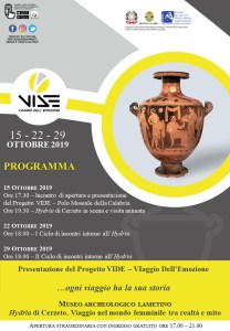 La locandina degli eventi del Progetto Vide al museo Archeologico Lametino: “L’Hydrìa di Cerzeto. Viaggio nel mondo femminile tra realtà e mito”