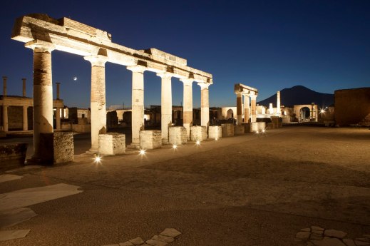 La suggestiva visione notturna dell’area monumentale del foto di Pompei (foto parco archeologico di Pompei)