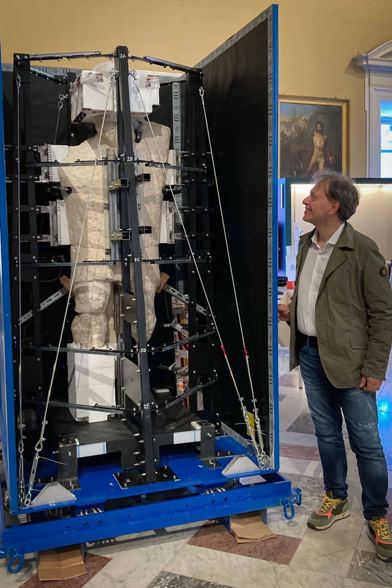 Il direttore del Mann, Paolo Giulierini, assiste all’apertura della cassa con il Pugilatore, uno dei Giganti di Mont’e Prama, giunta al museo (foto valentina cosentino)