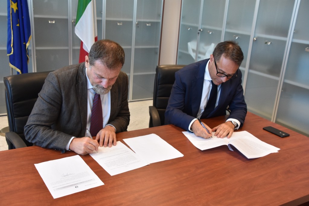 La firma del protocollo d’intesa tra il procuratore del Tribunale di Torre Annunziata, procuratore Pierpaolo Filippelli, e il Parco archeologico di Pompei, dg Massimo Osanna (foto parco archeologico di Pompei)