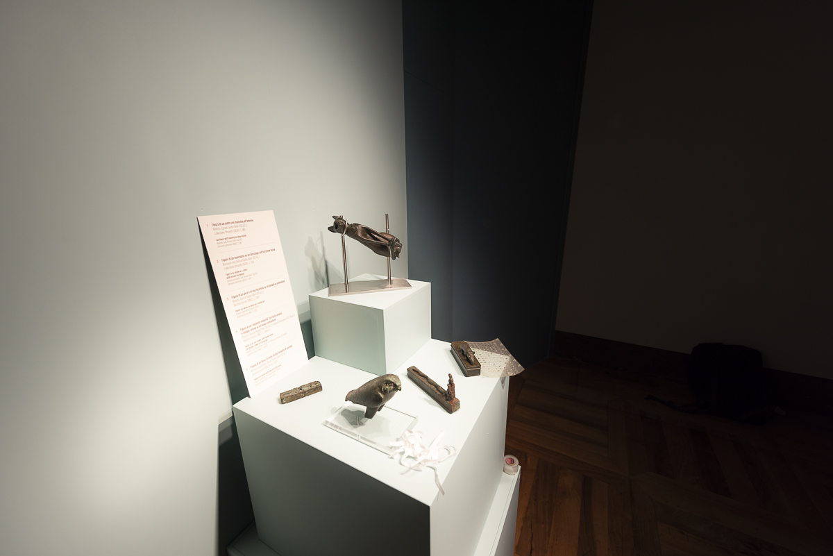 Al centro dell’esposizione: un gatto bronzeo che contiene ancora resti di una mummia; un contenitore ancora sigillato e inscritto, simile ad una cappella, su cui poggia un toporagno; e ancora i contenitori di un falco, un geco e un’anguilla-serpente, che contenevano mummie ormai perdute. Stele, statuette votive e amuleti raffiguranti animali e dèi compongono il resto dell’esposizione. Gli antichi egizi credevano che le anime degli animali fossero dei messaggeri tra le persone e gli dèi. Gli animali pertanto venivano mummificati e depositati dai sacerdoti in speciali cimiteri nel corso di processioni religiose. I culti animali e la mummificazione raggiunsero l’apice durante il Periodo Tardo e Tolemaico (664–332 a.C. e 332–30 a.C.), periodo nel quale grandi animali sacri come i tori Mnevis o Apis e la deposizione rituale delle loro mummie erano di fondamentale importanza per il re e il potere reale. Animali più piccoli come falchi, ibis e gatti, ma anche toporagni, lucertole e altre creature legate alla terra, venivano anch’essi mummificati e depositati a milioni nei cimiteri di tutto il paese. Molti animali avevano un significato particolare o potevano incarnare l’essenza degli esseri divini o simboleggiare le forze della natura ed erano visti come avatar o ipostasi, cioè oggettivazioni delle caratteristiche essenziali delle divinità. Di conseguenza, le divinità erano spesso rappresentate in forma animale o con fattezze animali.