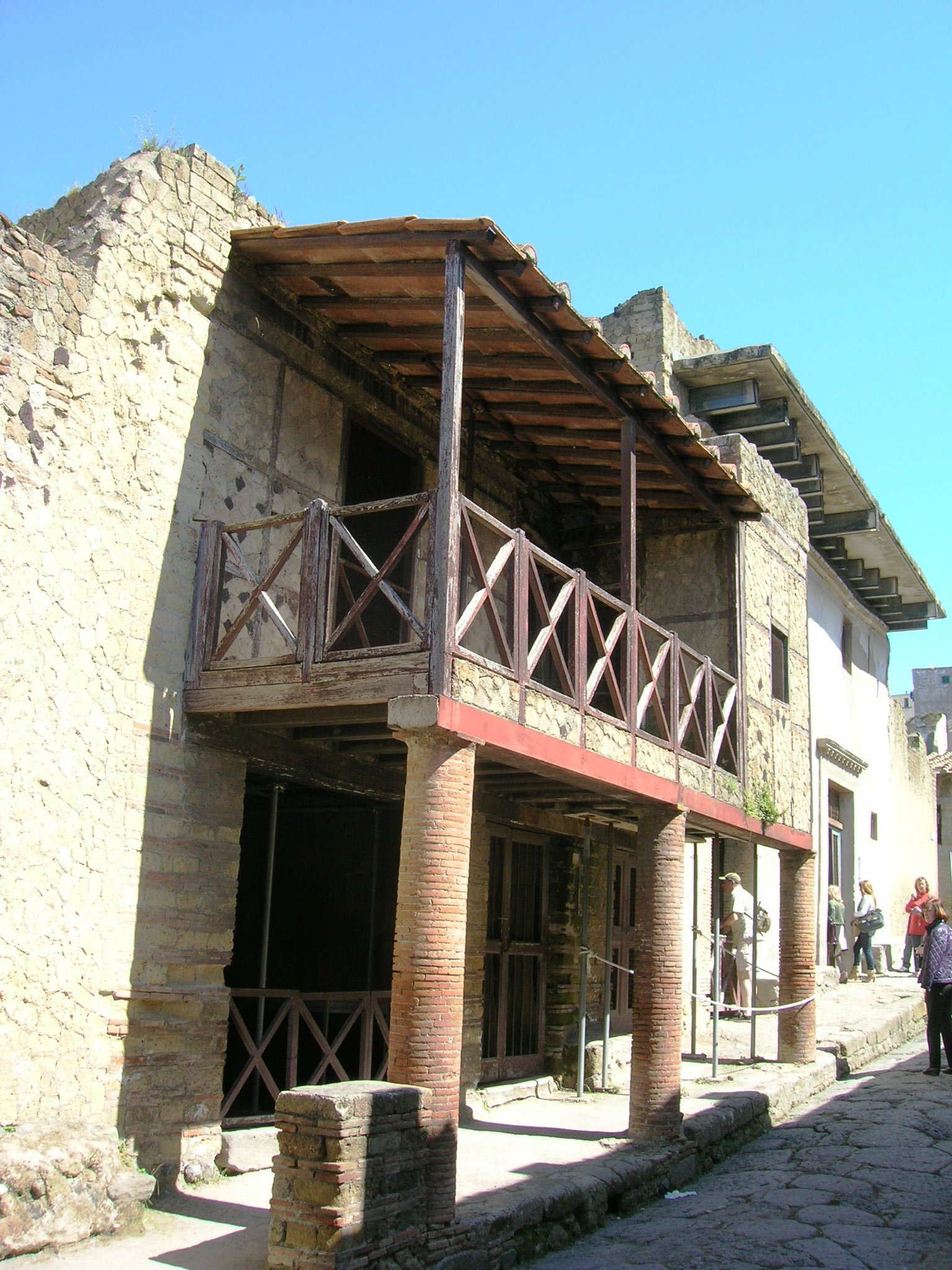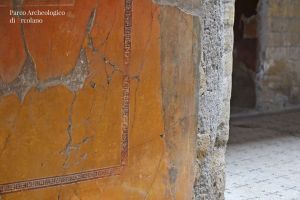 La Casa del Colonnato Tuscanico: il nucleo dell’abitazione, incentrato sull’atrio pavimentato in cocciopesto (un tritume di terracotta, calce e sabbia, resistente all’umidità), fu ristrutturato in età augustea (27 a.C. – 14 d.C.); l’impluvium (il bacino in cui confluiva l’acqua al centro delle case) fu rivestito di marmi e trasformato in fontana; le pareti furono decorate in “terzo stile”, una particolare decorazione pittorica risalente agli anni tra il 20 a.C. e il 50 d.C. Il peristilio, ossia il colonnato tuscanico, fu aggiunto inglobando una casa attigua e gli ambienti che si sviluppavano intorno ad esso furono decorati con affreschi e mosaici risalenti agli anni immediatamente precedenti all’eruzione del 79 d.C. Dal piano superiore, invece, provengono un tesoretto di monete del valore di 1400 sesterzi e un sigillo di bronzo.
