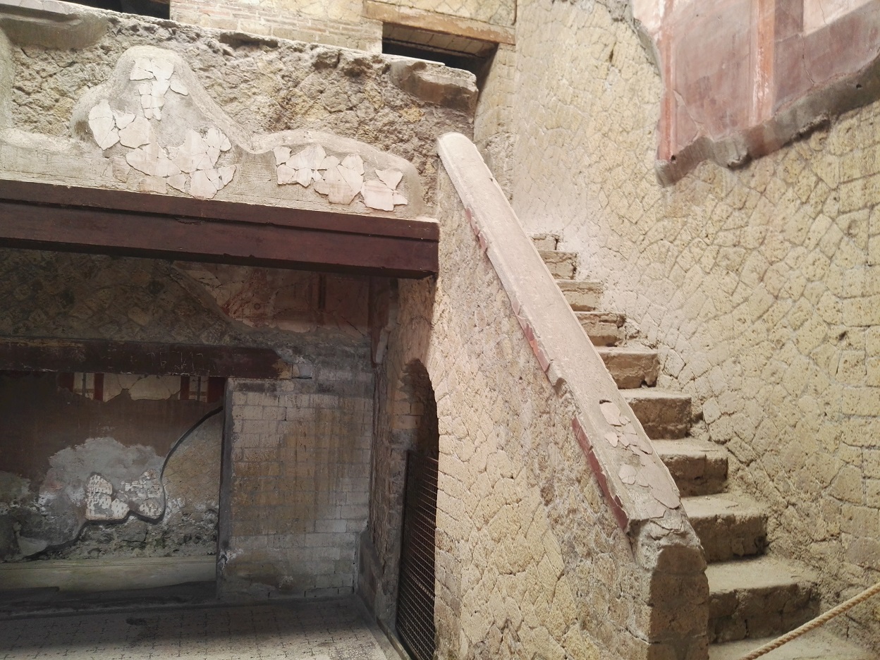 Andiamo alla scoperta della Casa Sannitica. Le abitazioni erano e sono sempre cose vive, si trasformano man mano che scorre la storia dei loro proprietari e inquilini, in un mutare continuo, che l’archeologia ci consente spesso di conoscere anche nei dettagli. Ad Ercolano, la Casa Sannitica ci racconta come è stata erosa con il passare del tempo, avendo dovuto, da un lato, cedere l’intero quartiere del peristilio ad altre due abitazioni, e, dall’altro, rendere indipendente il piano superiore con una scala esterna, evidentemente per il bisogno di darlo in affitto. Ma a ricordarci il primo splendore di questa domus, resta la raffinatezza dell’atrio con il finto loggiato di semicolonne ioniche collegate da eleganti transenne a reticolato, che, dall’alto della parete, si impone subito alla vista di chi attraversa il corridoio di ingresso.