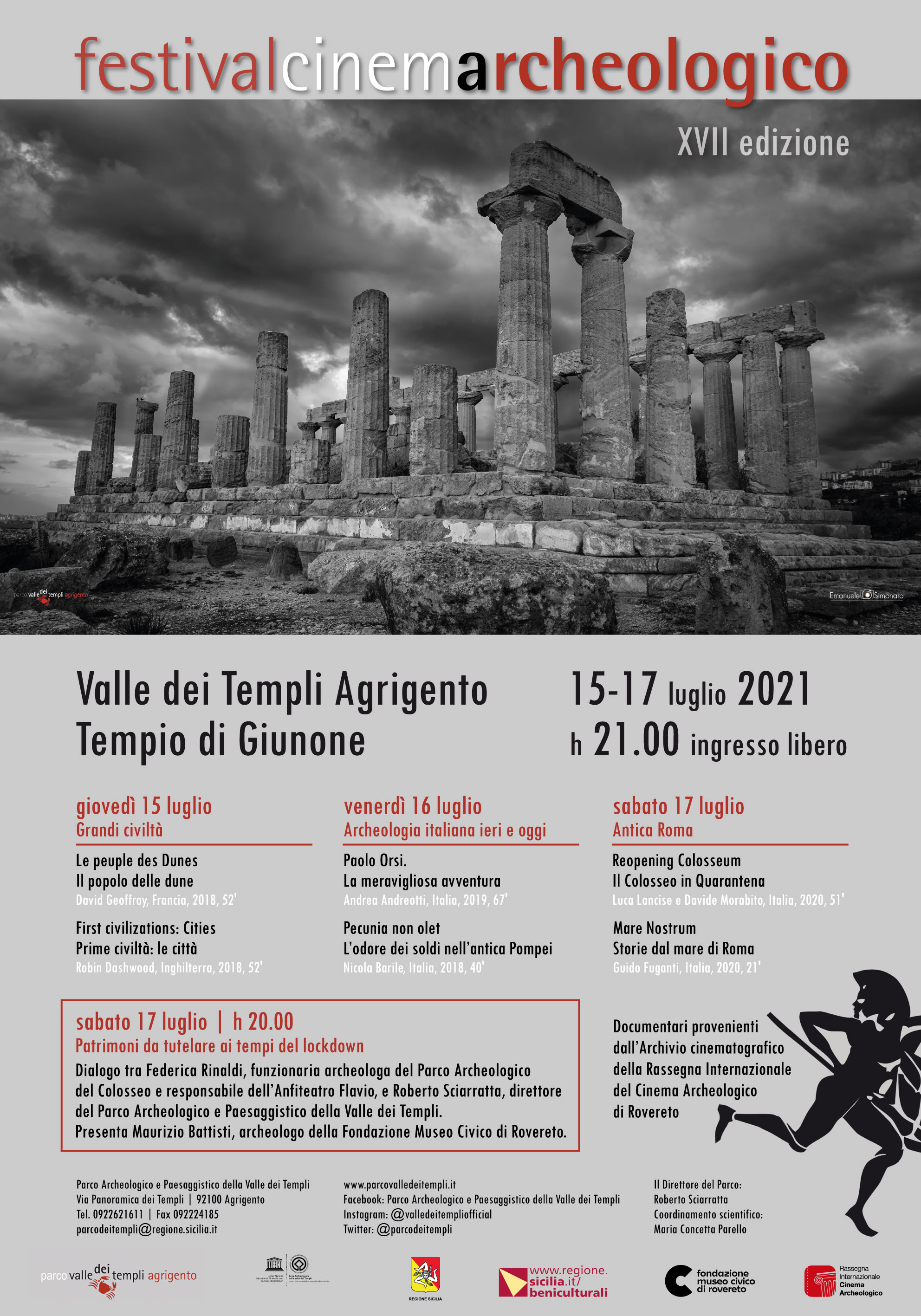 Quattro sezioni per i film in concorso con altrettanti premi: “premio Paolo Orsi per il cinema archeologico” (sezione principale): film archeologici dedicati alla tematica della tutela e valorizzazione patrimonio tangibile; “L’Italia si racconta”, sezione dedicata a opere cinematografiche sull’Italia che parlano di patrimonio culturale immateriale come, tradizioni, storia, antiche comunità; “Cultura Animata”: animazioni italiane e straniere dedicate ad archeologia, popoli, culture; “Sguardi dal mondo”, sezione dedicata a opere cinematografiche provenienti da ogni paese del mondo che parlano di patrimonio intangibile, tradizioni, cultura, antiche comunità. A completamento di un programma basato in gran parte sulla proposta di film e documentari, il Festival propone contemporaneamente alle proiezioni: conferenze e momenti di approfondimento con esperti del settore; un concerto dedicato alla musica nel cinema; una serata sul documentario tra Storia e Sport; aperitivi al bistrot sui temi del Festival; laboratori e presentazioni di libri a cura delle librerie della città; visite guidate sul territorio; visite guidate alla mostra “C’era una volta la Peste” allestita al Museo della Città che si terrà in concomitanza con il festival; corsi di approfondimento e aggiornamento professionale (per studenti, giornalisti ed operatori); menù a tema e iniziative varie in collaborazione con gli esercizi commerciali del distretto San Marco nel centro storico cittadino. Prestigiosi gli ospiti di questa edizione, impegnati sia in serate a teatro che in spazi alternativi, sui temi del Festival. Incontri a teatro, giovedì 14 ottobre 2021, alle 20.45, Federico Buffa, su “1936: L’Olimpiade che ha cambiato il cinema”. Storie di uomini e di sport si intrecciano attraverso gli “sguardi” della regista Leni Riefenstahl. Sabato 16 ottobre 2021, alle 20.45, Leandro Piccioni e Quartetto Pessoa in concerto per pianoforte e quartetto d’archi “Musica per il cinema. Omaggio a Ennio Morricone”; domenica 17 ottobre 2021, alle 16.30, Nicolò Bongiorno su “Raccontando l’India: Il Ladakh”. Incontri al bistrot: tre aperitivi a tu per tu con l’esperto alle 17 nel Bistrot dello chef stellato Alfio Ghezzi. Giovedì 14 ottobre 2021, “Il lungo viaggio dell’archeologia”, con Andrea Augenti, archeologo; venerdì 15 ottobre 2021, “Nôtre Dame: tecnologie e progetti per il restauro del secolo”, con Tiziano Straffelini, esperto di restauro di monumenti; sabato 16 ottobre 2021, “Il fumetto tra storia e fiction: Martin Mystère a Venezia”, con Andrea Artusi, disegnatore.