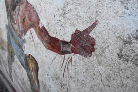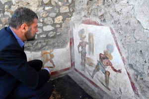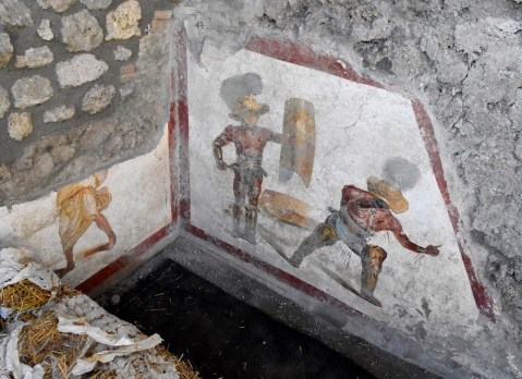 “È molto probabile che questo luogo fosse frequentato da gladiatori”, spiega il direttore generale Massimo Osanna. “Siamo nella Regio V, non lontani dalla caserma dei gladiatori da dove, tra l’altro, provengono il numero più alto di iscrizioni graffite riferite a questo mondo. In questo affresco, di particolare interesse è la rappresentazione estremamente realistica delle ferite, come quella al polso e al petto del gladiatore soccombente, che lascia fuoriuscire il sangue e bagna i gambali. Non sappiamo quale fosse l’esito finale di questo combattimento. Si poteva morire o avere la grazia. In questo caso c’è un gesto singolare che il trace ferito fa con la mano, forse, per implorare salvezza; è il gesto di adlocutio, abitualmente fatto dall’imperatore o dal generale per concedere la grazia. L’ambiente di rinvenimento è solo parzialmente portato in luce – su un lato emerge un’altra piccola porzione di affresco che rivela la presenza di un’altra figura- in quanto lo scavo dello stesso è stato possibile a seguito dell’intervento di rimodulazione dei pendii dei fronti e alla loro messa in sicurezza, che costituisce l’esigenza prioritaria di tutto il cantiere della Regio V”.
