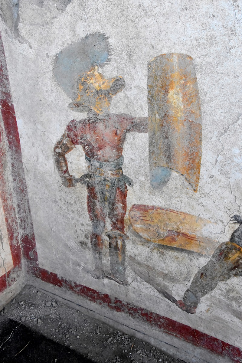 “È molto probabile che questo luogo fosse frequentato da gladiatori”, spiega il direttore generale Massimo Osanna. “Siamo nella Regio V, non lontani dalla caserma dei gladiatori da dove, tra l’altro, provengono il numero più alto di iscrizioni graffite riferite a questo mondo. In questo affresco, di particolare interesse è la rappresentazione estremamente realistica delle ferite, come quella al polso e al petto del gladiatore soccombente, che lascia fuoriuscire il sangue e bagna i gambali. Non sappiamo quale fosse l’esito finale di questo combattimento. Si poteva morire o avere la grazia. In questo caso c’è un gesto singolare che il trace ferito fa con la mano, forse, per implorare salvezza; è il gesto di adlocutio, abitualmente fatto dall’imperatore o dal generale per concedere la grazia. L’ambiente di rinvenimento è solo parzialmente portato in luce – su un lato emerge un’altra piccola porzione di affresco che rivela la presenza di un’altra figura- in quanto lo scavo dello stesso è stato possibile a seguito dell’intervento di rimodulazione dei pendii dei fronti e alla loro messa in sicurezza, che costituisce l’esigenza prioritaria di tutto il cantiere della Regio V”.