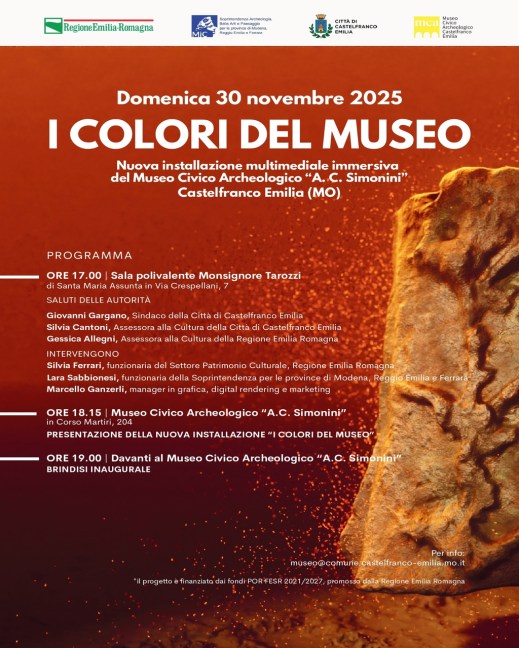 L’hanno chiamata “I colori del Museo”: è la nuova installazione multimediale immersiva del museo civico Archeologico “A. C. Simonini” di Castelfranco Emilia (Mo), che propone un inedito percorso di scoperta e valorizzazione del patrimonio archeologico cittadino attraverso luce, suono e tecnologia. “I colori del Museo” viene presentata domenica 30 novembre 2025, alle 17, nella sala polivalente di Santa Maria Assunta e museo civico Archeologico di Castelfranco Emilia. L’iniziativa, gratuita con ingresso libero, promossa dalla Città di Castelfranco Emilia e dalla Regione Emilia-Romagna, rappresenta un passo importante nel processo di innovazione e accessibilità del museo, rendendo l’esperienza di visita più coinvolgente e contemporanea.
