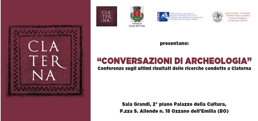 Due incontri per conoscere gli ultimi risultati sulle ricerche condotte a Claterna a Ozzano Emilia (Bo). Sono le “Conversazioni di Archeologia” promosse al Palazzo della Cultura da Comune di Ozzano dell’Emilia, soprintendenza Archeologia, belle arti e paesaggio per la città metropolitana di Bologna e le province di Modena, Reggio Emilia e Ferrara, associazione culturale “Centro Studi Claterna Giorgio Bardella e Aureliano Dondi”. Ingresso gratuito. Per informazioni: tel. 051/791337 · email: museo@comune.ozzano.bo.it