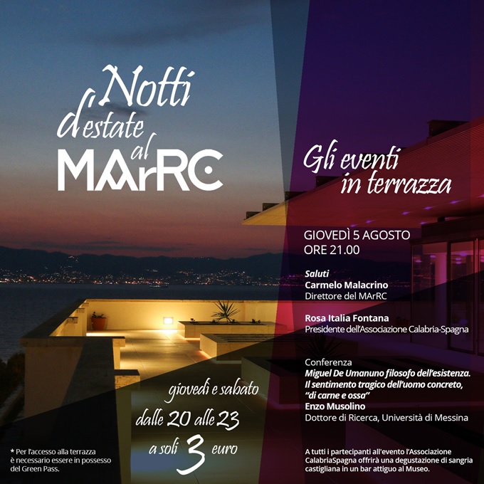 Reggio Calabria. Per le “Notti d’Estate” al museo Archeologico nazionale sesto appuntamento in sinergia con l’associazione CalabriaSpagna. Con Enzo Musolino dibattito dedicato a Miguel De Unamuno. Attivo sul web il servizio di biglietteria online. Green Pass obbligatorio da venerdì 6 agosto