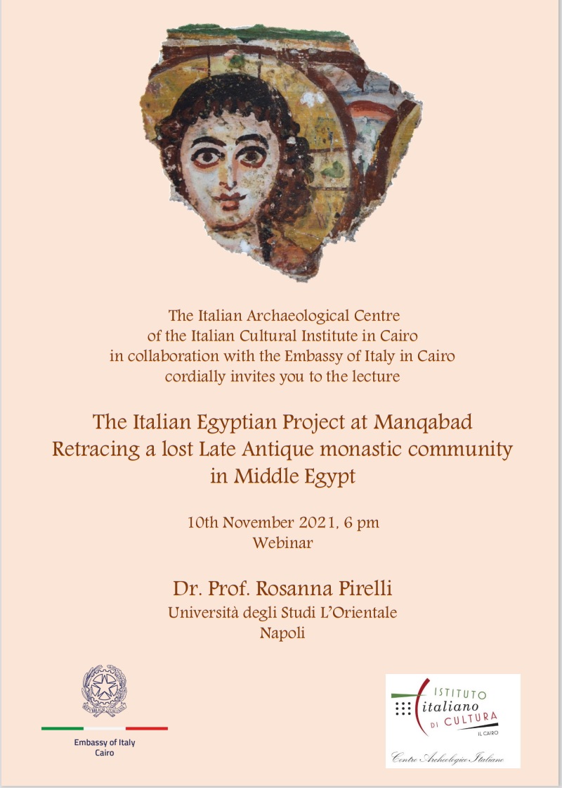 L’appuntamento è mercoledì 10 novembre 2021, alle 17 ora italiana (18 ora egiziana) per il webinar “Il progetto italo-egiziano a Manqabad (Asiut): riscoprire una comunità monastica tardoantica perduta nel Medio Egitto” a cura della prof.ssa Rosanna Pirelli, dell’università L’Orientale di Napoli, promosso dal Centro archeologico italiano dell’Istituto italiano di Cultura al Cairo in collaborazione con l’ambasciata italiana al Cairo. La conferenza potrà essere seguita attraverso Microsoft Teams al link https://teams.microsoft.com/l/meetup-join/19%3ameeting_MmRkOThmODItOGNiYi00MTlhLTljMDktZDQzYTQ5NDY3YjBi%40thread.v2/0?context=%7b%22Tid%22%3a%2234c64e9f-d27f-4edd-a1f0-1397f0c84f94%22%2c%22Oid%22%3a%22babdcf46-9524-4ae8-ae30-59e751a8a656%22%7d (istruzioni: 1- clicca sul link; 2- scegli “continua su questo browser”, non sarà necessario scaricare alcuna applicazione; 3- fai clic su partecipa e sarai nella sala riunioni; 4- Se ti iscrivi da cellulare, dovrai installare l’app).
