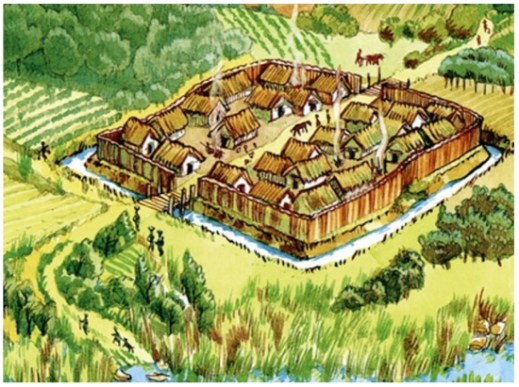 Disegno ricostruttivo di una tipica Terramara con il villaggio fortificato circondato da un terrapieno o un fossato