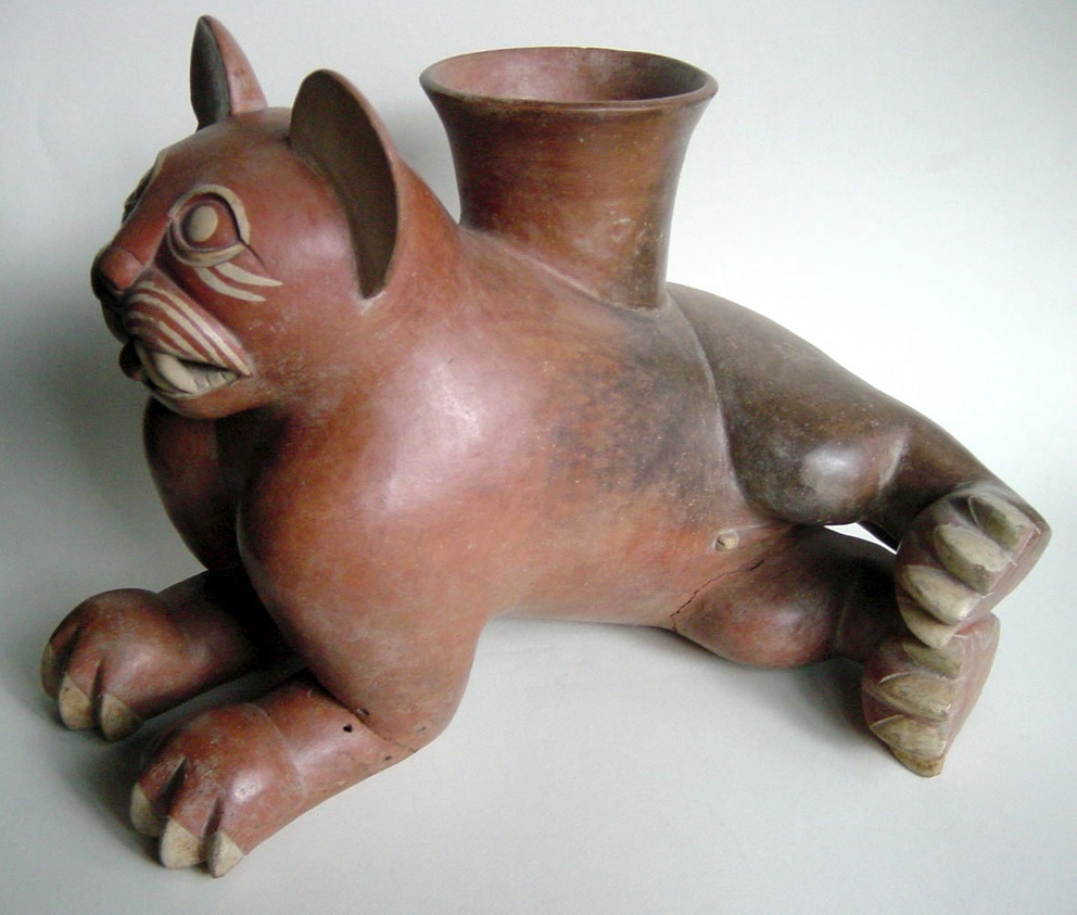 L’opera, molto ben eseguita, raffigura un felino (identificato come giaguaro) sdraiato su un fianco con la testa eretta: un’iconografia tipica ma qui riprodotta in una dimensione considerevole, particolare che, secondo gli esperti, la renderebbe “assolutamente rara nel panorama della coroplastica peruviana che di norma ha prodotto oggetti di più piccole dimensioni”. Un esemplare simile (differisce per la più comune foggia “a bottiglia” con ansa a staffa e per le dimensioni ridotte, 19 x 21) si trova al Museo Cileno di Arte Precolombiana (Chile, Santiago).