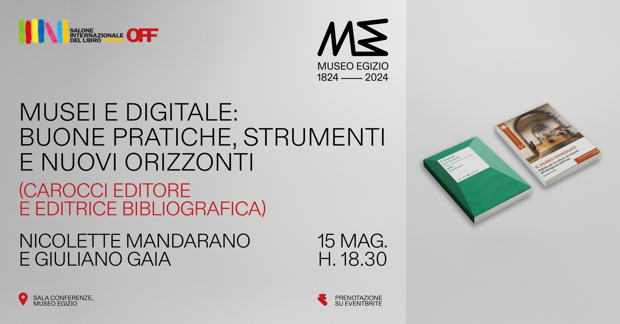 Nell’ambito del Salone internazionale del Libro OFF 2025, appuntamento al museo Egizio di Torino: giovedì 15 maggio 2025, alle 18.30, in sala conferenze, incontro su musei e digitale con Nicolette Mandarano, autrice del libro “Il digitale per i Musei” (Carocci Editore) e Giuliano Gaia, autore del libro “Il museo immediato” (Editrice Bibliografica), in dialogo con il direttore Christian Greco. Modera Emanuela Totaro, segretario generale Fondazione Kainòn ETS. L’evento è gratuito con prenotazione obbligatoria su Eventbrite al link https://www.eventbrite.it/…/musei-e-digitale-buone…. Nei giorni successivi all’evento, la conferenza sarà trasmessa anche in streaming sulla nostra pagina Facebook e sul nostro canale YouTube. Come l’innovazione tecnologica influenza il mondo dei musei? Come si sposa il tempo lento di queste istituzioni con l’immediatezza del digitale? Quali nuovi strumenti hanno a disposizione le istituzioni culturali per la valorizzazione e la comunicazione? In che modo supportare il pubblico nella fruizione di esperienze digitali? E quali sono i mezzi, i contenuti e i linguaggi più adatti per catturarne l’attenzione e aumentarne il coinvolgimento? Una conversazione per rispondere a queste e altre domande centrali per i musei di oggi.