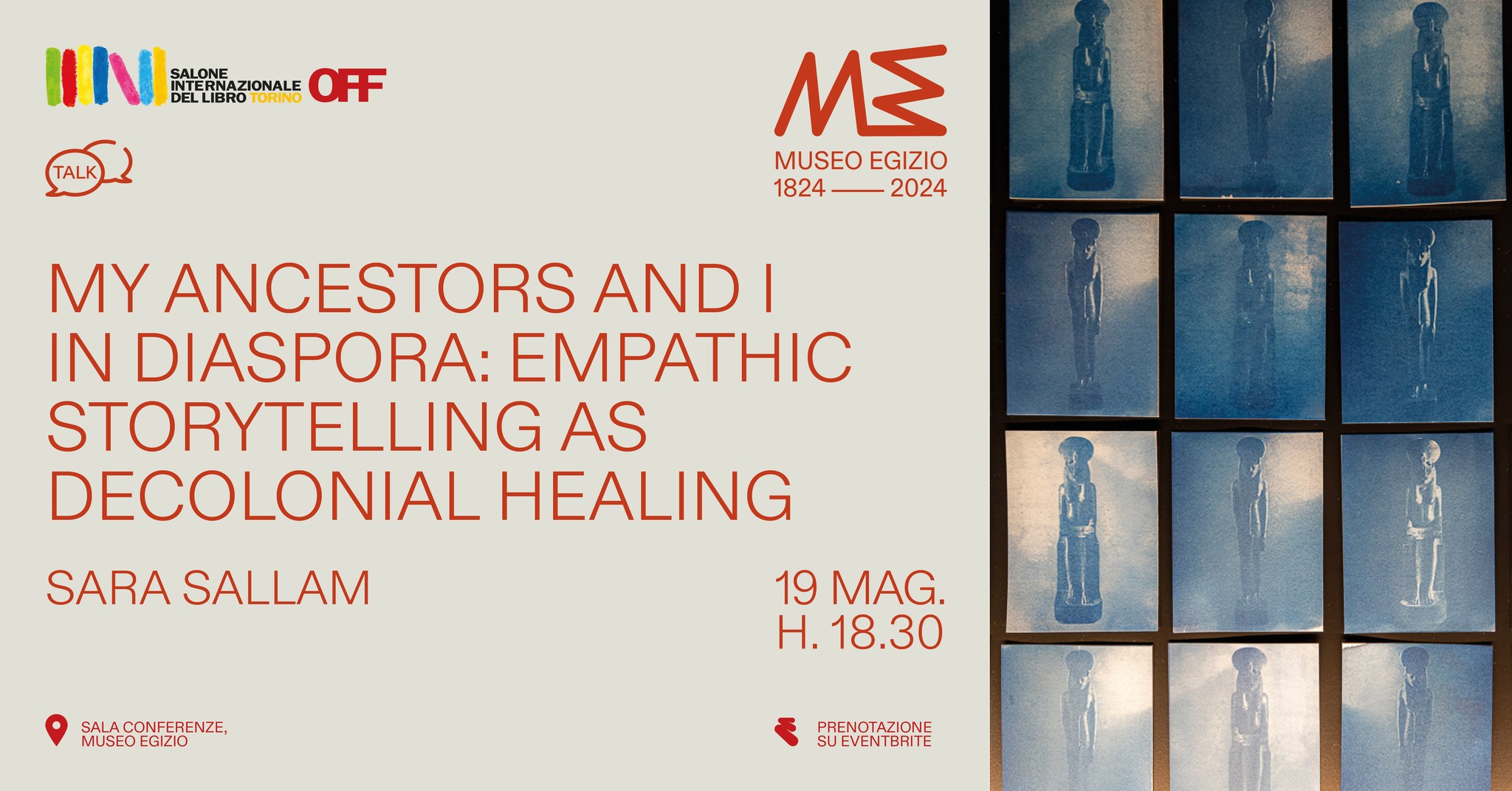 Nell’ambito del Salone internazionale del Libro OFF 2025, appuntamento al museo Egizio di Torino: lunedì 19 maggio 2025, alle 18.30, in sala conferenze, “My ancestors and I in diaspora: empathic storytelling as decolonial dealing”, incontro con l’artista Sara Sallam e il curatore del museo Egizio Paolo Del Vesco. In inglese con traduzione simultanea in sala. L’evento, realizzato in occasione di EXPOSED – Torino Foto Festival (16 aprile – 2 giugno 2025) nell’ambito del programma “Echoes”, è gratuito con prenotazione obbligatoria su Eventbrite al link https://www.eventbrite.it/…/my-ancestors-and-i-in…. Nei giorni successivi all’evento, la conferenza sarà trasmessa anche in streaming sulla nostra pagina Facebook e sul nostro canale YouTube. I due affronteranno le tematiche legate allo sradicamento, alla dispersione del proprio patrimonio culturale e alla costruzione di una relazione empatica con gli oggetti come mezzo per riparare le ferite di un passato coloniale ancora troppo presente in molte collezioni museali. Attraverso la descrizione dei suoi lavori e dell’installazione artistica appositamente realizzata per il museo Egizio, Sara Sallam ci trasporterà in un viaggio artistico fra Olanda, Italia ed Egitto antico e moderno. Dopo il talk sarà possibile visitare liberamente l’installazione dell’artista e la Galleria dei Re. Le installazioni artistiche di Sara Sallam per il museo Egizio sono state realizzate grazie al contributo del Mondriaan Fund, organizzazione olandese votata all’arte visiva e al patrimonio culturale.