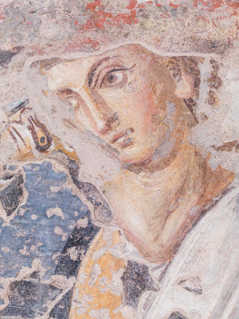 “Il primo strato, quindi l’immagine più antica”, spiegano gli archeologi del PArCo, “risale alla prima metà del VI sec d.C. e raffigura Maria regina con Bambino e angelo, dipinta subito dopo la conquista bizantina della città. Del periodo successivo si conserva un’Annunciazione di cui rimane solo il volto della Vergine e la figura del cosiddetto Angelo “bello” realizzato dalla mano di un artista raffinato a testimonianza del breve periodo felice in cui la chiesa divenne palatina (565-578 d.C.). Il terzo strato permette di riconoscere due Santi identificati come Basilio e Giovanni e fu realizzato sicuramente dopo il 649 d.C. Nel quarto ed ultimo strato è riconoscibile parte di uno dei Padri della Chiesa, Gregorio Nazianzeno, raffigurato con San Basilio (705-707 d.C.)”.