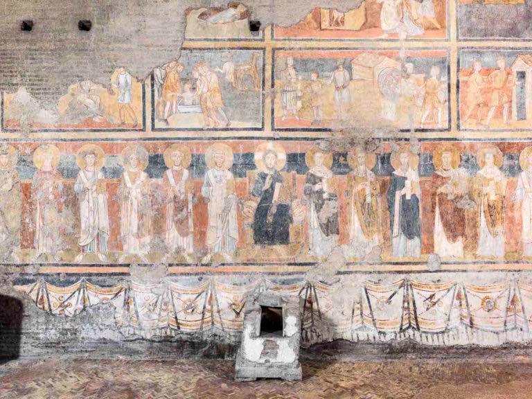 “Le pareti della chiesa – continuano gli archeologi del PArCo – verranno arricchite man mano da nuovi affreschi; la navata a sinistra dell’ingresso, per esprimere in maniera inequivocabile la fede verso la Chiesa di Roma, fu affrescata con Santi della chiesa greca e latina, con Cristo al centro e in alto scene del Vecchio Testamento (757-767 d.C.). A sinistra del presbiterio ancora oggi si può ammirare la splendida e colorata cappella di Teodoto, databile al 741-782 d.C. dove le immagini sacre rivestono ancora un ruolo fondamentale mentre a Bisanzio erano già state cancellate dall’iconoclastia . A destra del presbiterio, la Cappella dei Santi Medici fa parte della campagna decorativa promossa da Giovanni VII nel 705-707 d.C.”.