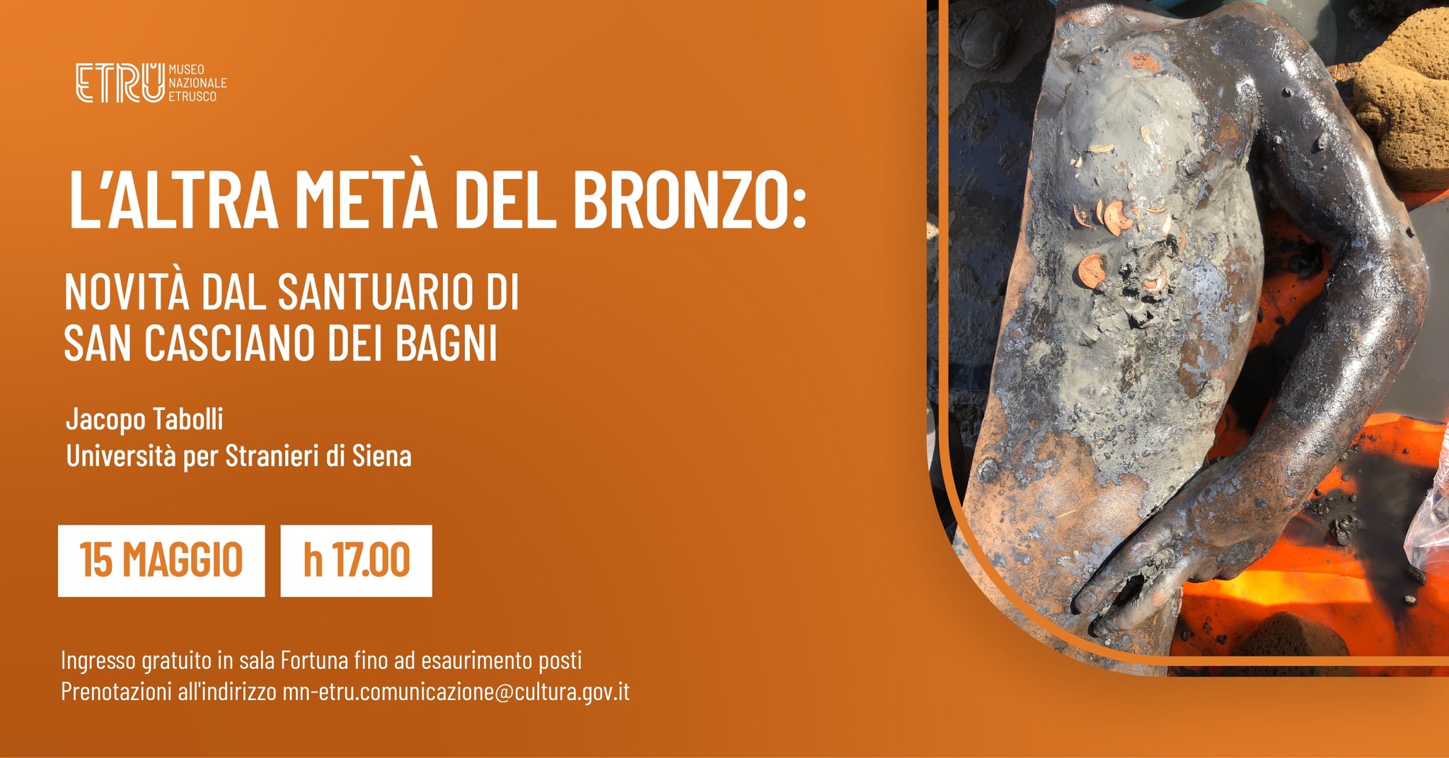 PROGRAMMA. Alle 9.30 SALUTI ISTITUZIONALI: Luigi Oliva (direttore ICR), Luigi La Rocca (capo dipartimento per la Tutela del Patrimonio culturale), Tomaso Montanari (rettore università per Stranieri di Siena), Agnese Carletti (sindaco di San Casciano dei Bagni, SI), Gabriele Nannetti (soprintendente ABAP SI-GR-AR). Modera: Luigi Oliva (direttore ICR). INTERVENTI: alle 10, Vilma Basilissi (ICR) “La conservazione dei bronzi di San Casciano dei Bagni: protocolli condivisi di intervento e di monitoraggio”; 10.20, Ada Salvi (SABAP SI-GR-AR) “La tutela a San Casciano dei Bagni: tra ricerca, restauro e valorizzazione”; 10.40, Emanuele Mariotti (Comune San Casciano dei Bagni), Jacopo Tabolli (Unistrasi) “La ricerca nello spazio, oltre il tempo dello scavo”; 11, PAUSA. Modera: Ulderico Santamaria (università della Tuscia); 11.20, Marco Giamello (università di Siena), Sonia Mugnaini (OPD) “Della superficie e dell’interno dei bronzi: patine e terre di fusione”; 11.40, Juri Agresti (CNR Nello Carrara), Salvatore Siano (CNR Nello Carrara) “Della materia: analisi e caratterizzazione dei bronzi archeologici”; 12, Paolo Piccardo (università di Genova), Roberto Spotorno (università di Genova) “Dentro la materia: comprendere e misurare i processi di corrosione dei bronzi archeologici”; 12.20, Vilma Basilissi (ICR), Laura Rivaroli (L Rivaroli Restauri) “Il restauro dei bronzi saturi d’acqua: da atto critico a prassi operativa”; 12.40 TAVOLA ROTONDA: Luigi Oliva, Ulderico Santamaria, Vilma Basilissi, Ada Salvi, Jacopo Tabolli, Marco Giamello, Paolo Piccardo, Salvatore Siano.