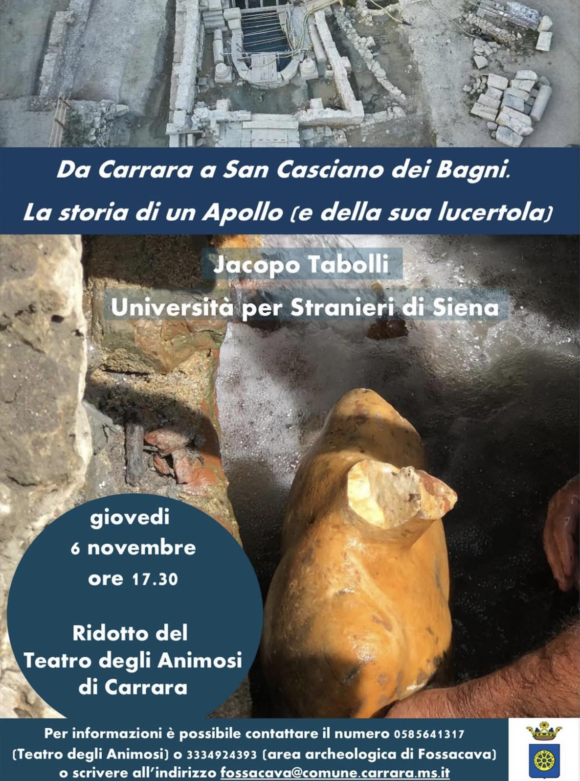 Giovedì 6 novembre 2025, alle 17.30, al Ridotto del Teatro degli Animosi di Carrara, la conferenza “Da Carrara a San Casciano dei Bagni. La storia di un Apollo (e della sua lucertola)” col prof Jacopo Tabolli, direttore scientifico dello scavo del santuario etrusco-romano al Bagno Grande di San Casciano dei Bagni (Si), terrà un intervento dedicato alla statua dell’Apollo Sauroctono, copia romana in marmo di Carrara da un originale di Prassitele, rinvenuta a San Casciano nel 2023. L’opera e la sua storia saranno al centro di un incontro nel quale storia dell’arte e archeologia si intrecciano alle vicende millenarie delle cave del territorio di Carrara. Per informazioni è possibile contattare i numeri 0585641317 (Teatro degli Animosi) o 3334924393 (Area archeologica di Fossacava) oppure scrivere all’indirizzo fossacava@comune.carrara.ms.it