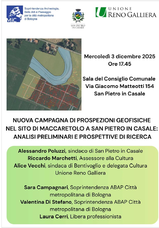 Mercoledì 3 dicembre 2025, alle 17.45, nella sala del consiglio comunale, Palazzo del Municipio, in via Giacomo Matteotti 154 a San Pietro in Casale (Bo) la soprintendenza Archeologia Belle arti e Paesaggio per la città metropolitana di Bologna presenta “Il sito di Maccaretolo: nuova campagna di prospezioni geofisiche” con i risultati della nuova campagna di prospezioni geofisiche condotte nel sito di Maccaretolo a San Pietro in Casale. Intervengono Alessandro Poluzzi, sindaco di San Pietro in Casale; Riccardo Marchetti, assessore alla Cultura di San Pietro in Casale; Alice Vecchi, sindaco di Bentivoglio e delegata alla Cultura, Pari opportunità e Promozione del territorio per l’Unione Reno Galliera; Sara Campagnari, coordinatrice settore Archeologia della soprintendenza ABAP Città metropolitana di Bologna; Valentina di Stefano, funzionaria archeologa della soprintendenza ABAP di Bologna; Laura Cerri, archeologa esperta in prospezioni geofisiche. Evento gratuito fino ad esaurimento dei posti disponibili.