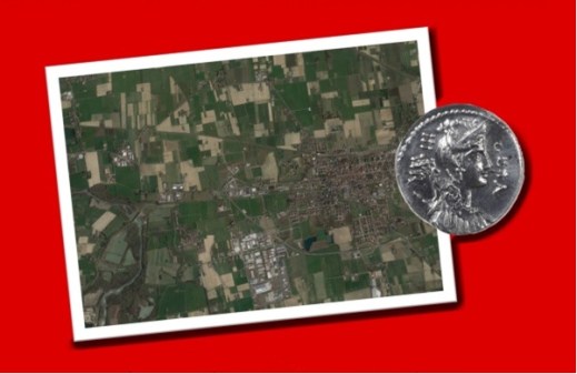 Aerofotogrammetria della mansio di Castelfranco Emilia e moneta proveniente dallo scavo nelal locandina di presentazione della mostra “Una sosta lungo la via Emilia, tra selve e paludi”