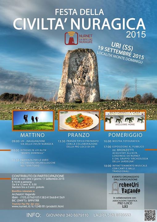 La giornata del 19 a Uri parte al mattino con l’inaugurazione della via della Civiltà Nuragica, alle 10 ci sarà il ritrovo nella località “Monte Dominigu” da dove partiranno le escursioni archeologiche nel territorio. Alle 13.30 il pranzo a cura della Pro Loco di Uri. Alle 16 verrà inaugurata la mostra fotografica e alle 17 ci sarà l’esposizione dei bronzetti acquistati all’asta da Nurnet e dal gruppo Archeologia della Sardegna, seguirà un intrattenimento musicale con canti e balli tradizionali.