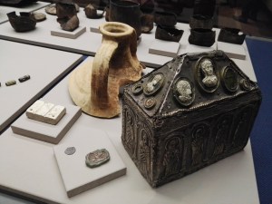 Allo sfarzo di alcuni manufatti dalle sepolture fanno riscontro i pochi materiali recuperati nei contesti urbani regionali (Parma, Fidenza-Pr, Rimini e Ravenna) della IV sezione “Città ed empori nell’alto Medioevo”. All’opposto, nell’VIII secolo spicca per vitalità e capacità economica l’emporio commerciale di Comacchio (Fe), importante centro lagunare aperto, in cui l’acqua gioca il ruolo fondamentale di via di comunicazione, trasporto e smistamento delle merci. Gli scavi e le ricerche archeologiche degli ultimi anni hanno recuperato reperti decisamente eccezionali, qui esposti, come una matrice per lettere in bronzo e un’altra per cammei vitrei bicolore, provenienti dagli scavi del 2008 in piazza XX Settembre a Comacchio. In vetrina anche una capsella per reliquie di fine IX secolo: viene da Cividale, ma il cameo con busto maschile su uno degli spioventi sembra realizzata con la matrice di Comacchio.